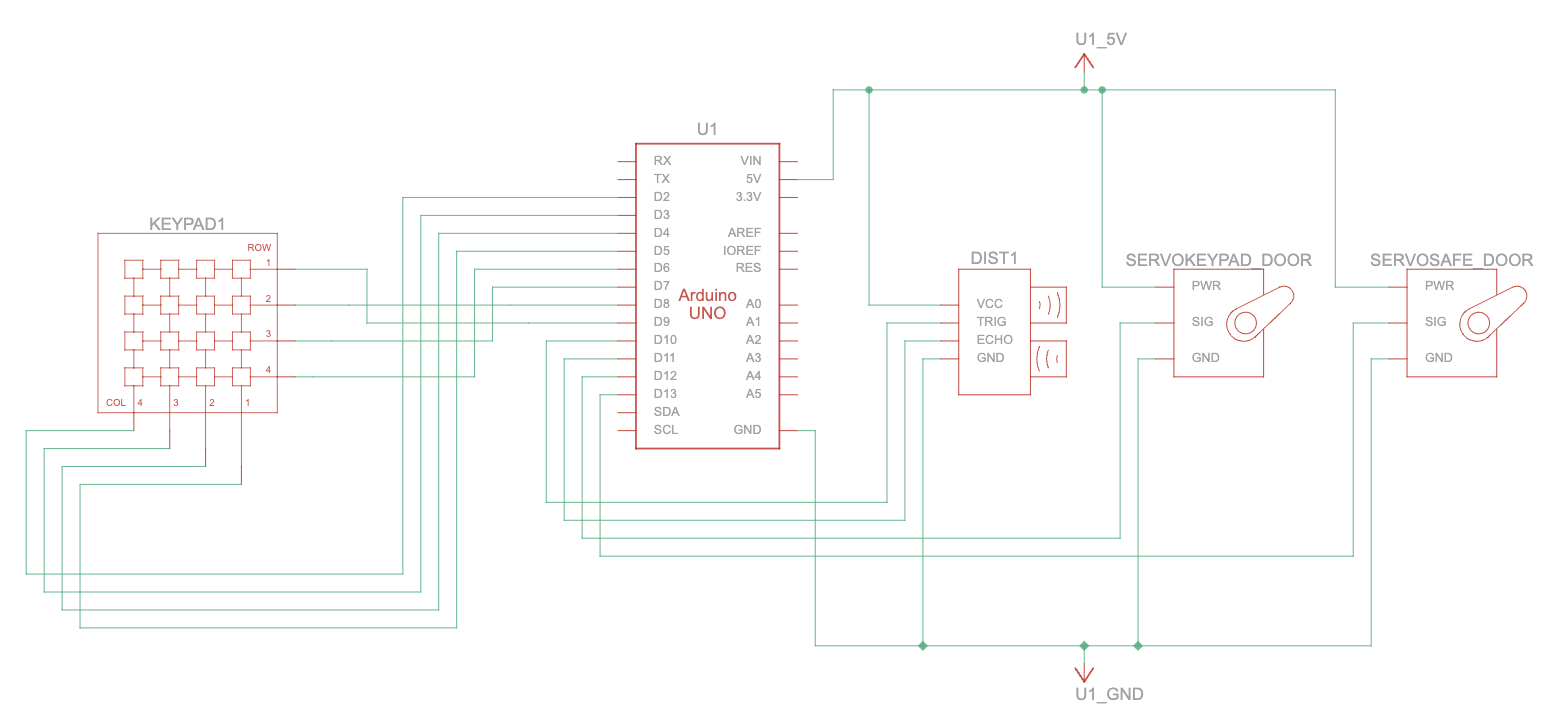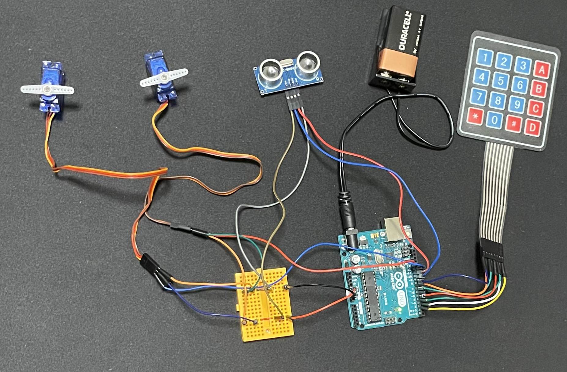 Arduino UNO, various wires, Bread board, 2 servo motors, Distance sensor, 4x4 Keypad