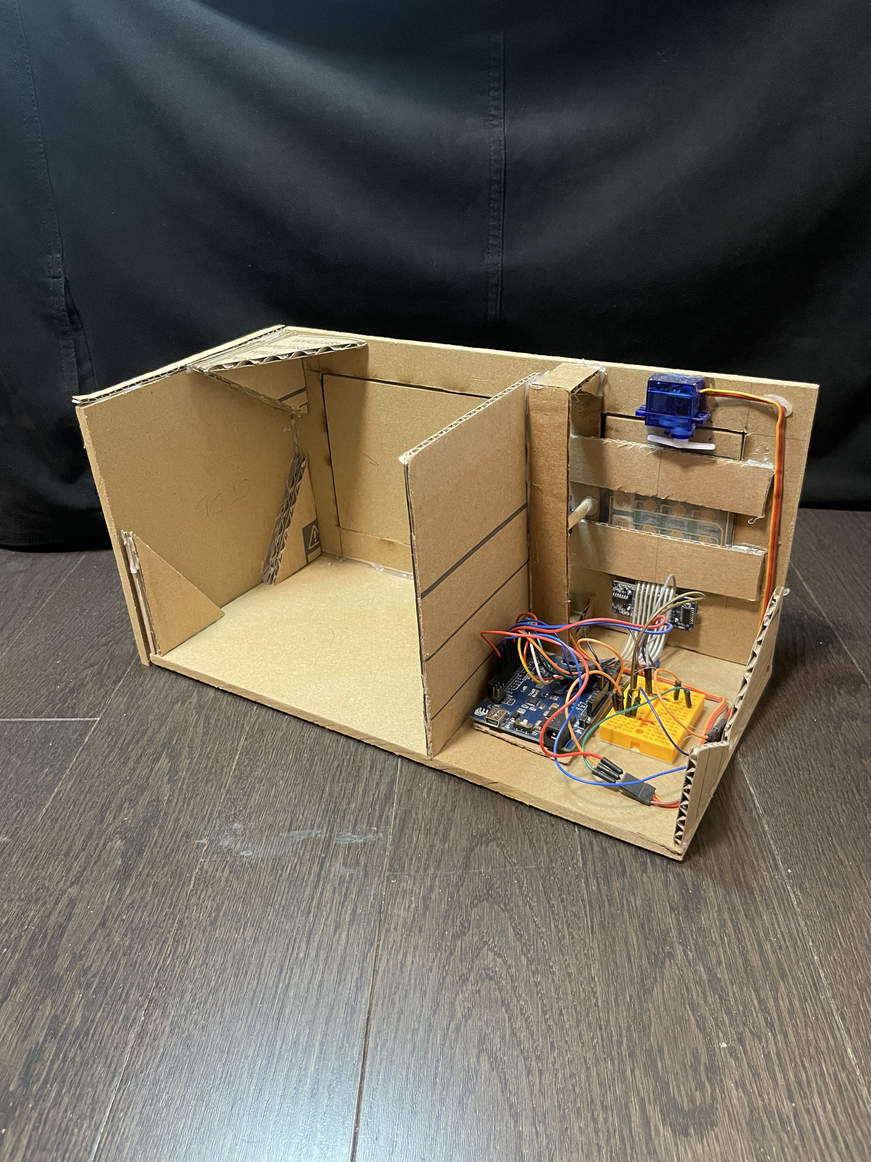 This Arduino UNO-controlled safe opens after a hand is waved around the keypad, in which it opens a door revealing the keypad. Once the correct PIN is entered access to the safe door is revealed.